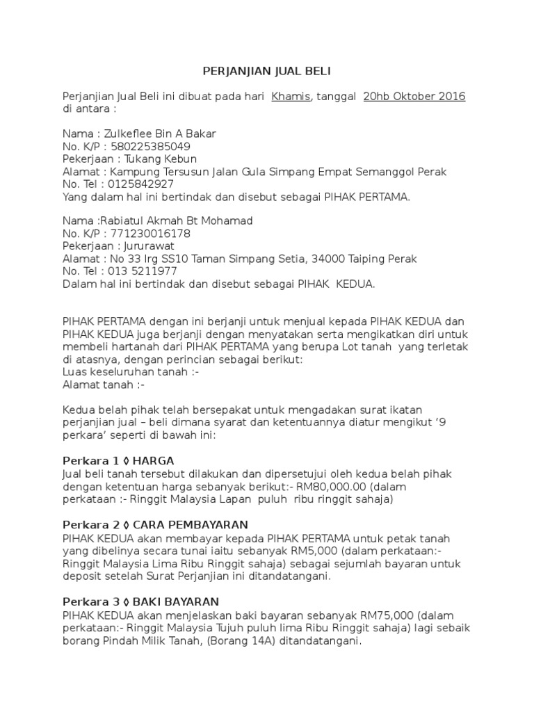 Perjanjian Jual Beli Tanah Malaysia : Contoh Surat Perjanjian Jual Beli Barang Malaysia Nusagates - Menerangkan deskripsi objek (tanah) yang akan diperjualbelikan.