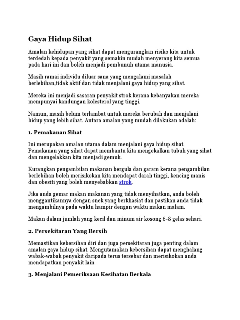 Pada pandangan saya, riadah bermaksud menyihatkan badan dan menenangkan fikiran. Kebaikan utama gaya hidup yang sihat ialah amalan yang membina ini sentiasa memastikan tahap kesihatan berada dalam keadaan yang baik. Melakukan senaman atau riadah 3. Di samping itu kepentigan amalan gaya hidup sihat ialah seseorang dapat memastikan tubuh badan mendapat khasiat dan vitamin yang mencukupi. Bersenam baik untuk kesihatan dan rohani. Membolehkan anda memiliki stamina dan keupayaan lebih untuk menikmati kehidupan. Gaya hidup sihat bermaksud seseorang individu yang mempunyai badan yang sihat dan selalu menjalani aktiviti yang berfaedah. Gaya hidup sihat bermaksud kehidupan yang berkualiti dalam menjalani aktiviti harian seseorang insan itu. Pemakanan seimbang membolehkan tubuh badan kita sihat dan tidak terlalu gemuk. Pada masa sekarang, sewajarnya masyarakat mengetahui kepentingan amalan gaya hidup sihat. Contoh karangan amalan gaya hidup sihat dan isi penting 1. Oleh itu, kita hendaklah mengamalkan makanan seimbang. Dalam meniti arus kemodenan yang berteraskan sains dan teknologi maklumat, faktor kesihatan masyarakat pada hari ini berada pada tahap yang membimbangkan pihak berkuasa terutamanya kementerian kesihatan malaysia.